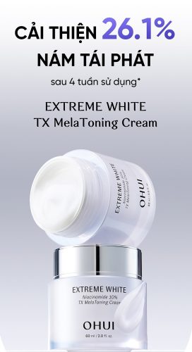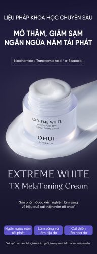 Kem dưỡng sáng, ngừa nám OHUI Extreme White TX Melatoning Cream với thành phần Snow Vitamin nâng cấp chứa 10% Niacinamide, 0.5% Tranexamic Acid cùng các hoạt chất dưỡng sáng độc quyền, giúp làm mờ đốm nâu, ngăn ngừa nám tái phát hiệu quả chỉ sau 4 tuần sử dụng.